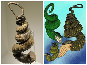我们较为熟悉的菊石、角石是已经灭绝的头足类动物。上图为双菊石属动物化石及复原图。