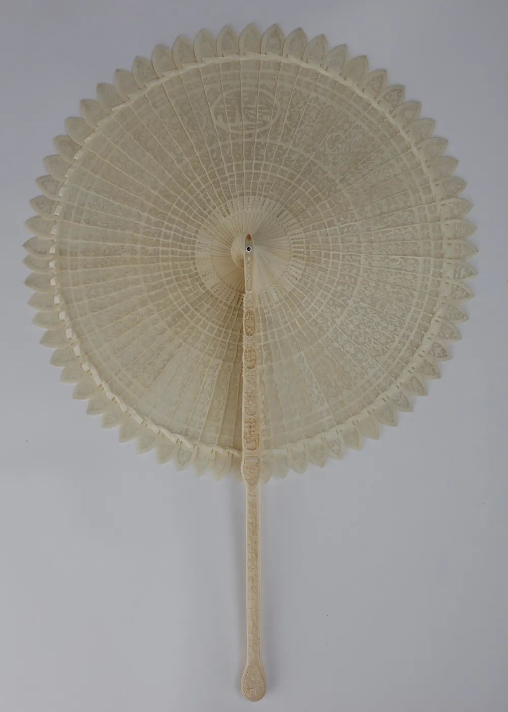如清象牙单面镂雕开光亭塔山水图扇,该扇扇面轻薄通透如蝉翼,采用单面镂通拉丝薄意浅浮雕的技法,由同心圆向外做九层装饰。其玲珑剔透的质感、鬼斧神工的技艺,完美体现了当时外销扇象牙雕刻工艺的高超水准。