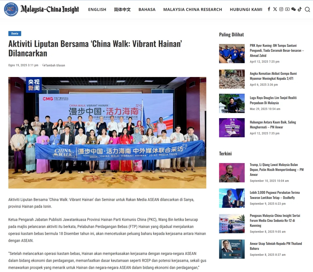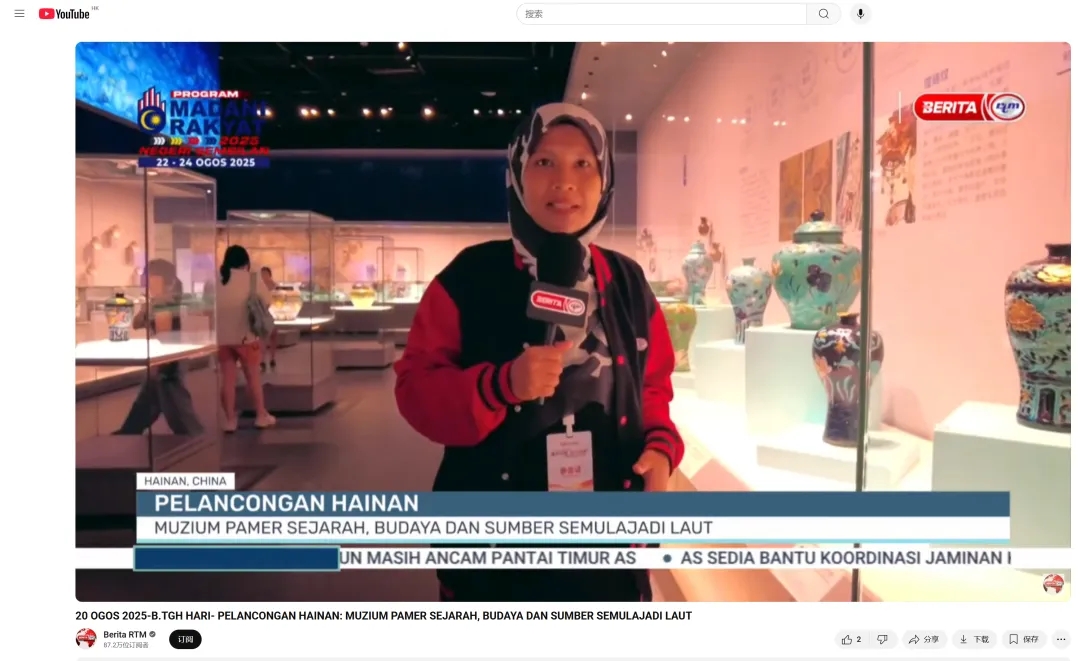 电视报道《“漫步中国·活力海南”活动启动 多国媒体实地探寻海南发展活力密码》于8月20日在马来西亚广播电视台播出,介绍记者参访中国(海南)南海博物馆,馆内展品生动展现海上丝绸之路的繁荣以及中外之间的密切交流,也彰显出中国在文物保护与历史研究方面的非凡实力。