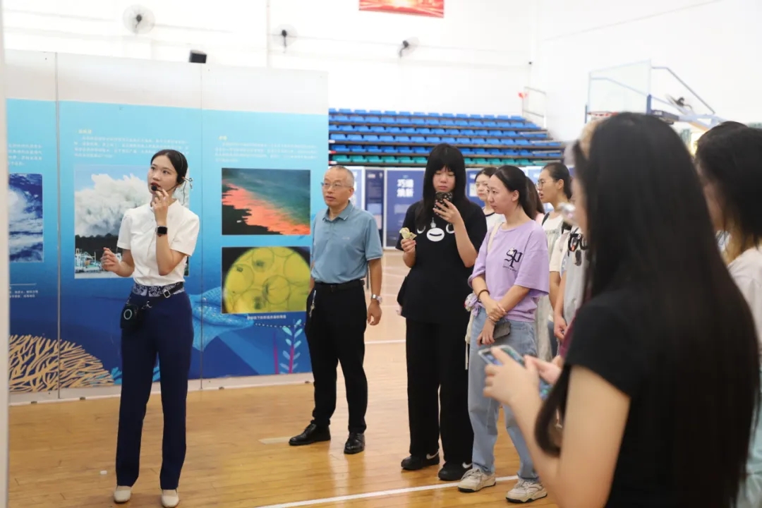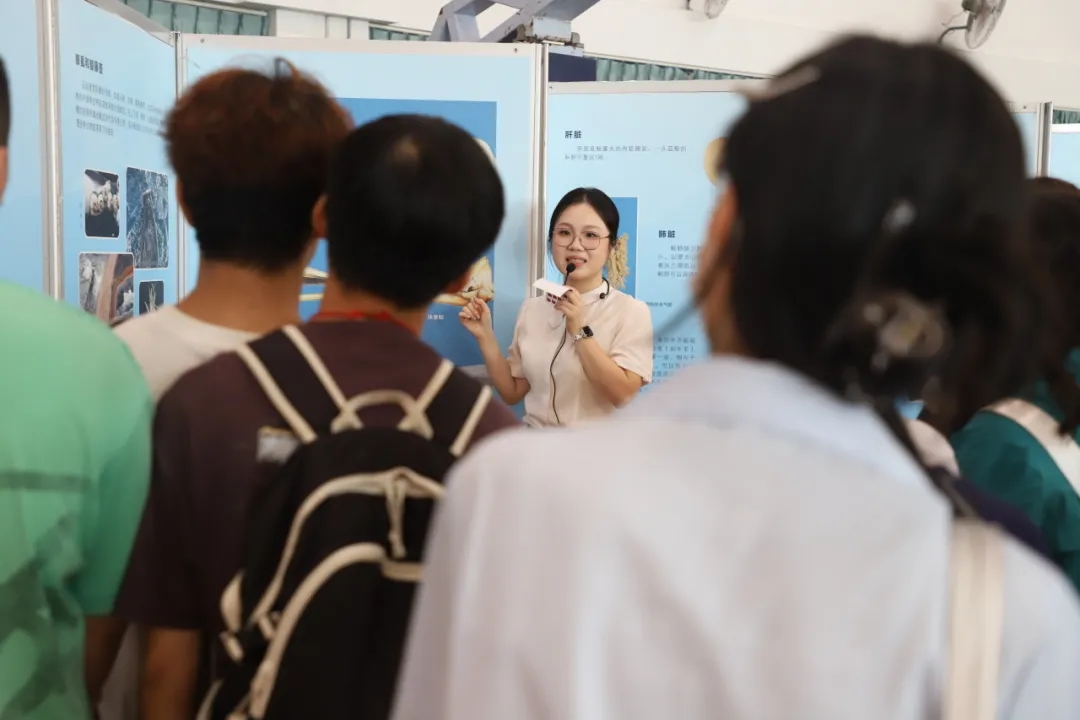 活动现场,“深蓝宝藏——南海西北陆坡一二号沉船考古成果特展”与“南海‘鲸’灵——馆藏鲸类标本展”等流动展览同步开启。学生们近距离驻足参观,讲解员结合珍贵考古资料与图文展板的生动讲述,让学生们直观感受到了南海水下文化遗产的厚重历史与海洋生态的丰富多样。