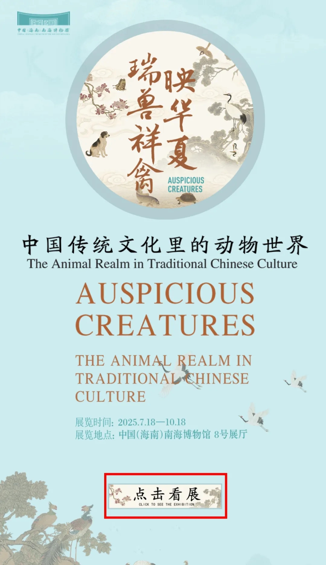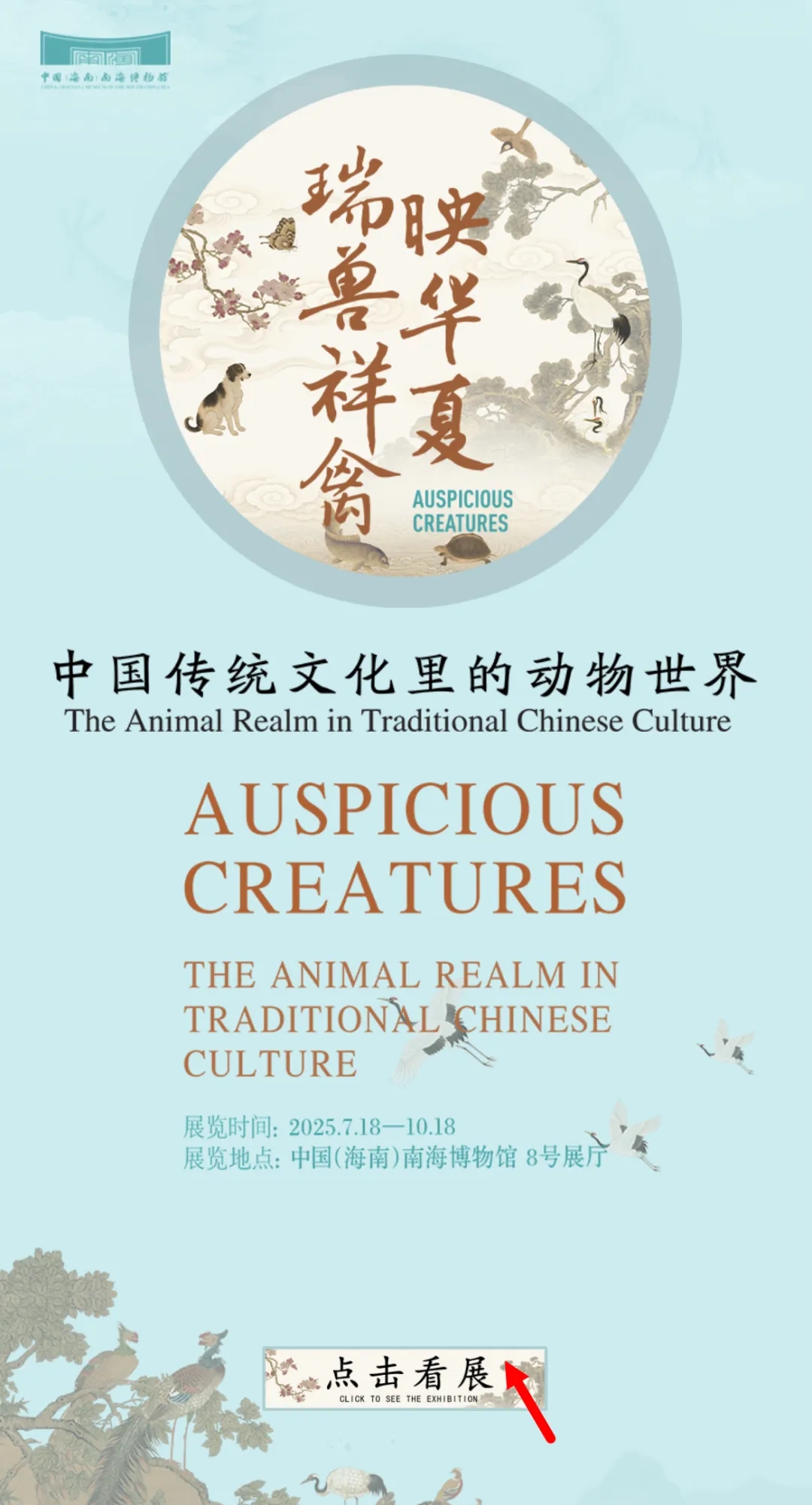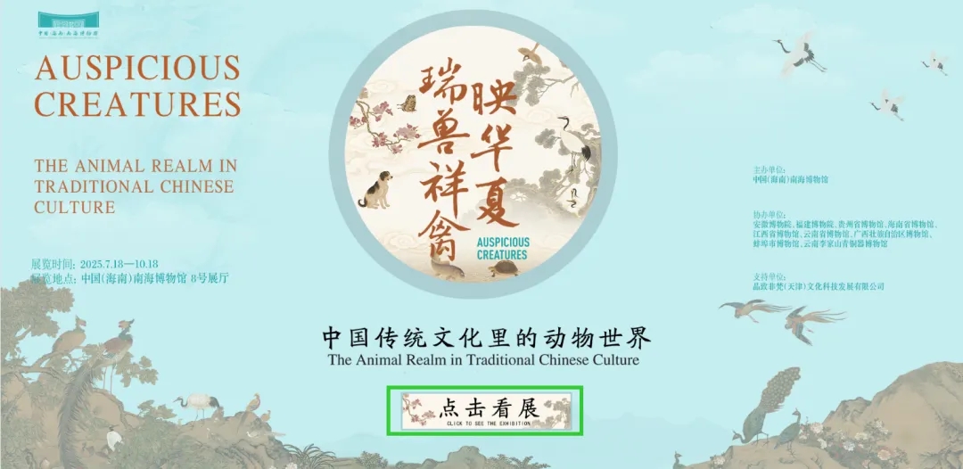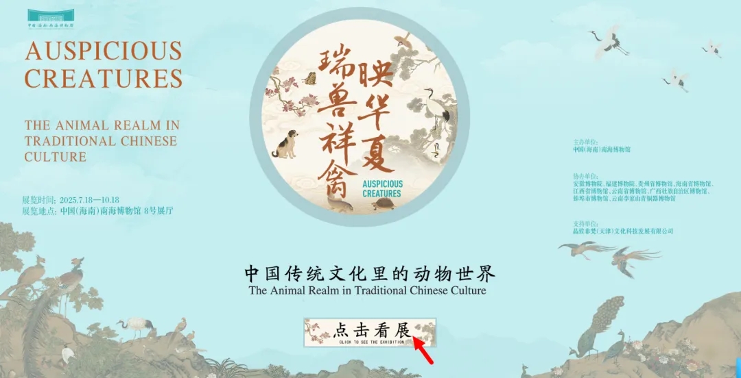 为延续展览热度,满足观众持续观展需求,中国(海南)南海博物馆特别推出“瑞兽祥禽映华夏——中国传统文化里的动物世界”虚拟展厅,邀您一键“云”游,开启一场跨越古今的动物文明探索之旅!