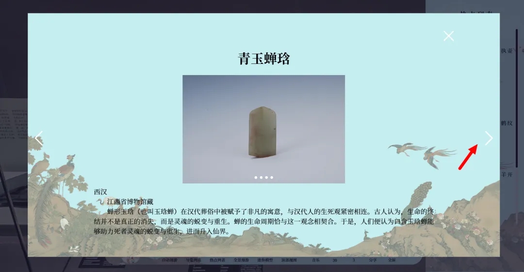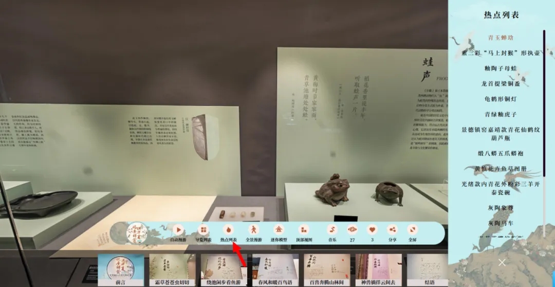虚拟展厅搭载“热点列表”功能,列表中的展品均提供文字、音频、视频等多方位解读;同时具备四倍高清细节放大功能,带您发现文物隐藏的精彩。