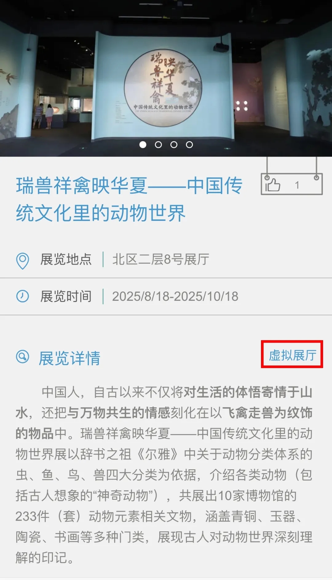 4.点击“瑞兽祥禽映华夏——中国传统文化里的动物世界”展览图片或名称进入展览页面。