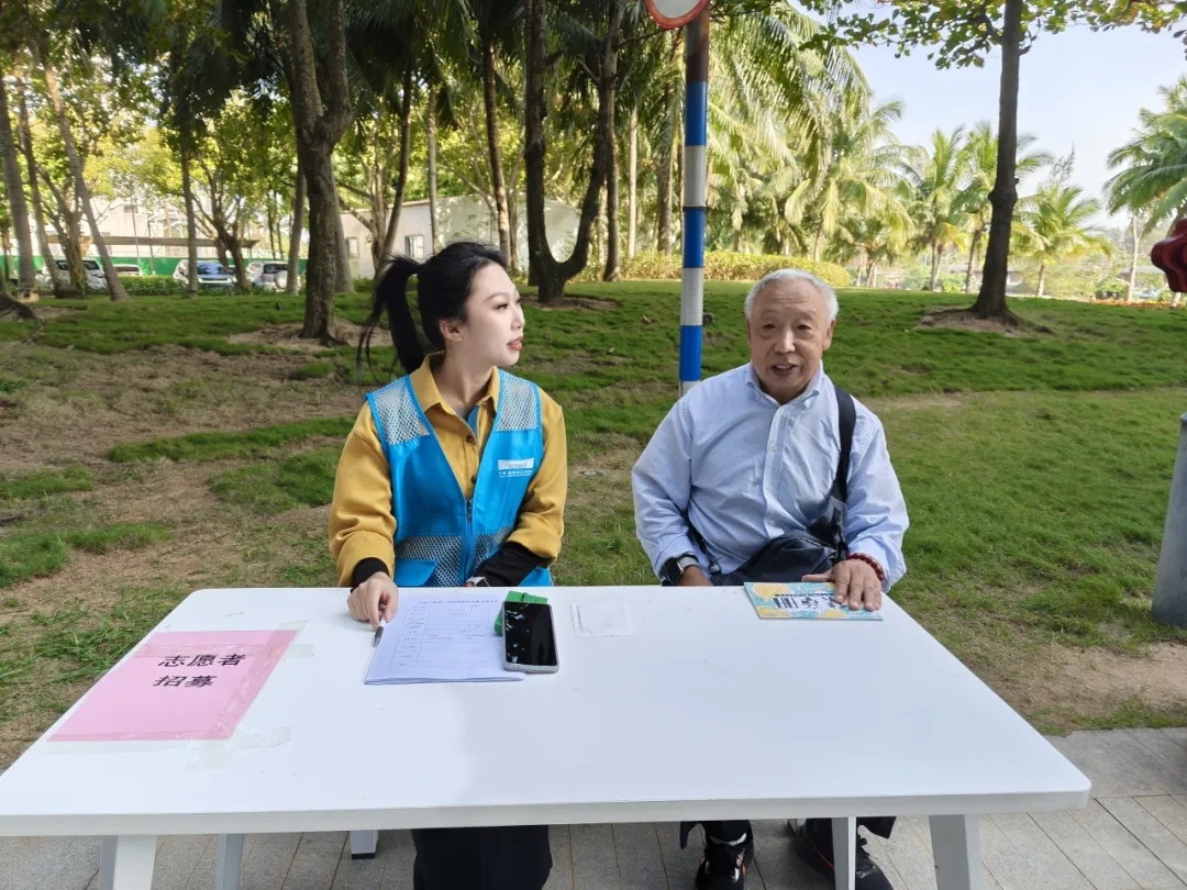 “南海蓝”志愿服务队招募点前也围了不少游客。大家有的咨询服务时间,有的询问报名条件,工作人员忙得不亦乐乎。