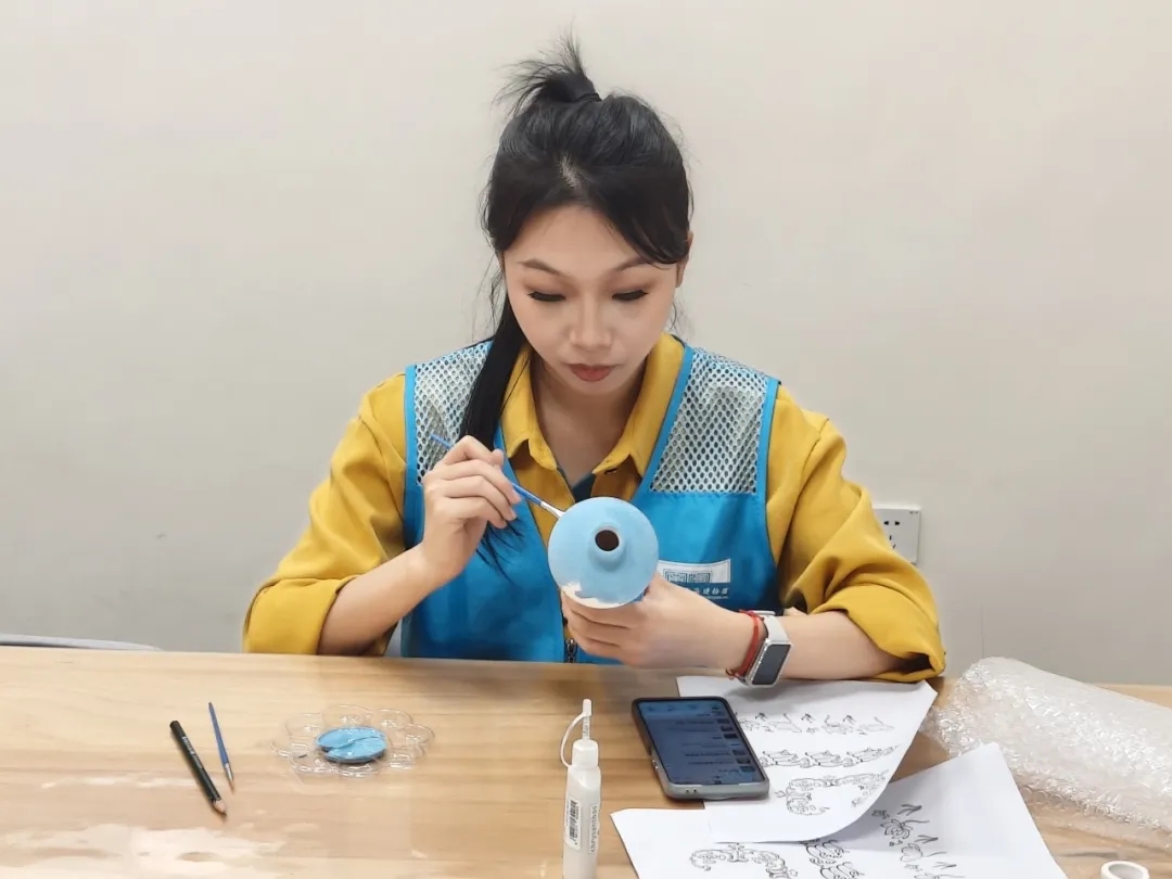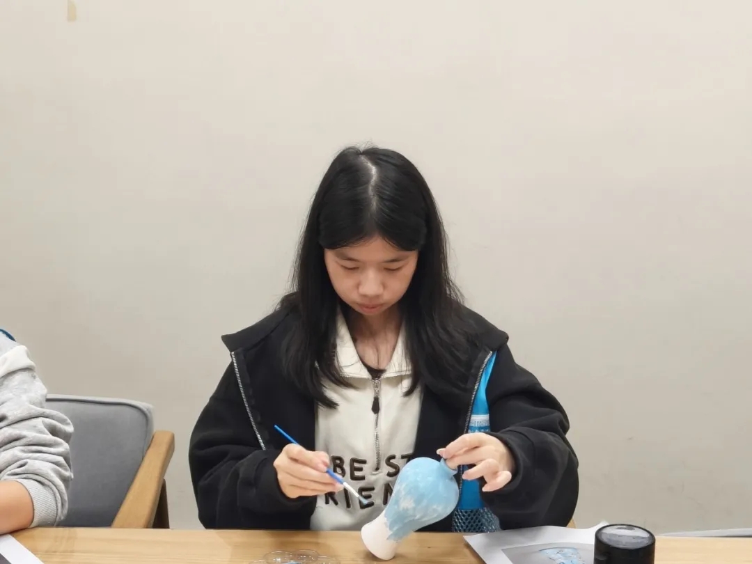 在老师的指导下,大家手持梅瓶,细细勾勒。有人选择传统的缠枝莲纹,一笔一画认真描摹;有人则大胆尝试自己设计的图案,刚开始手有点抖,线条歪歪扭扭,但慢慢找到感觉后,描绘出来的纹饰也愈发流畅。