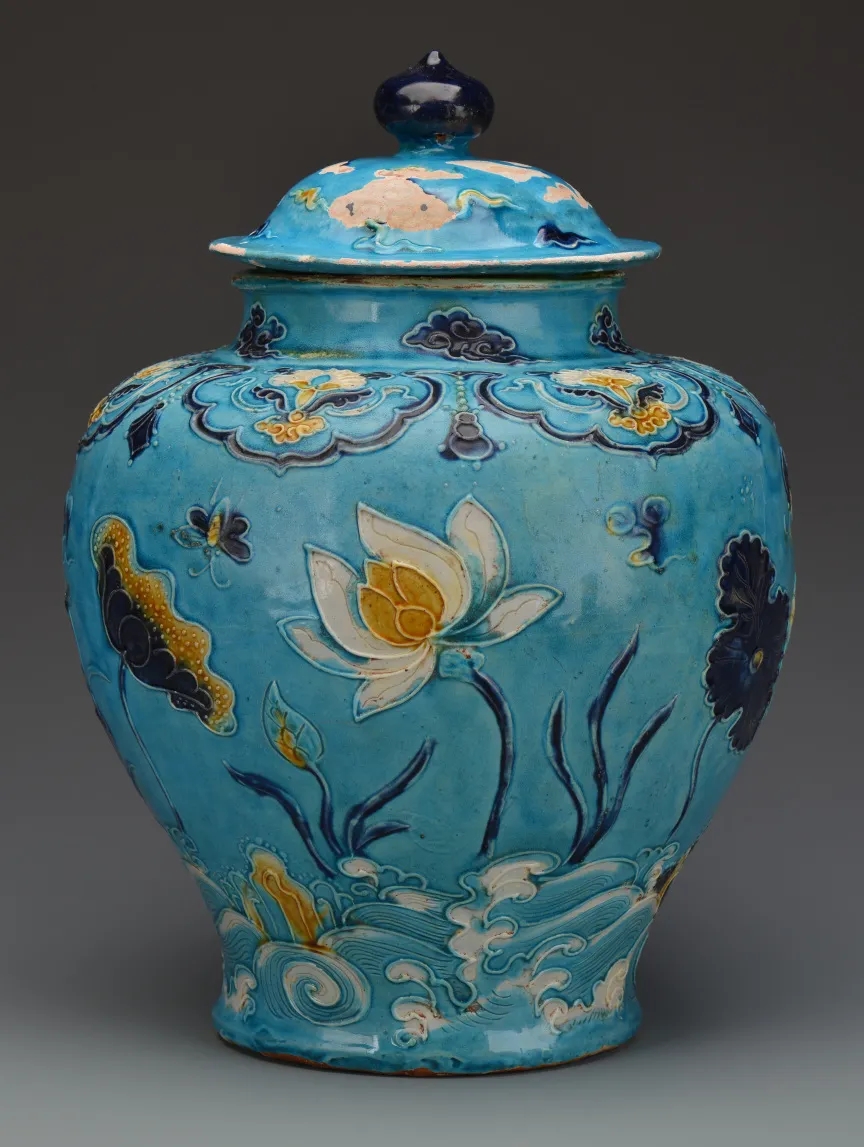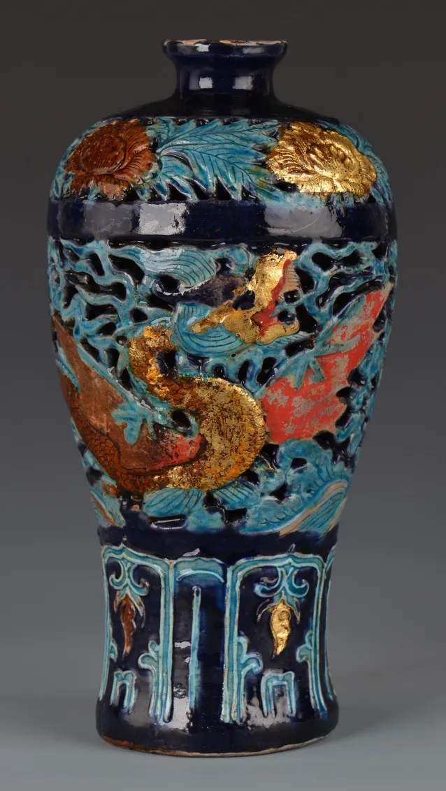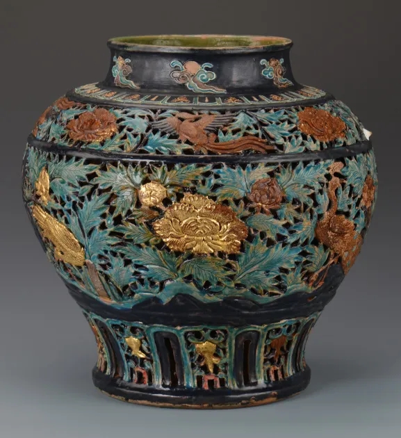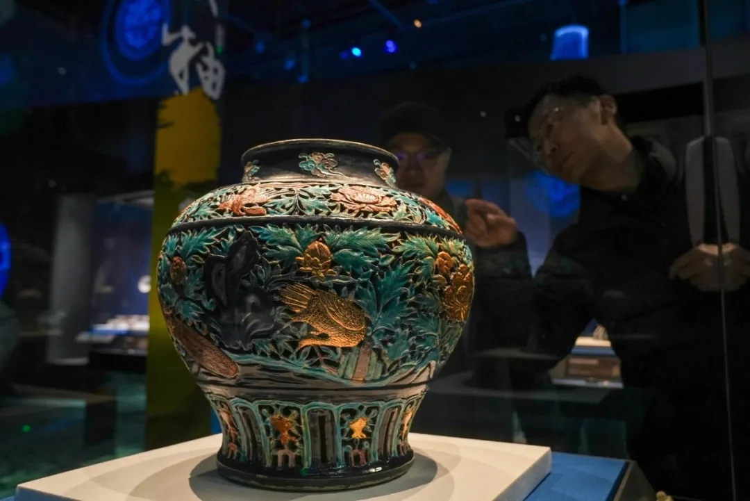 珐华贴金镂空孔雀牡丹纹大罐吸引参观者驻足。图/北京日报