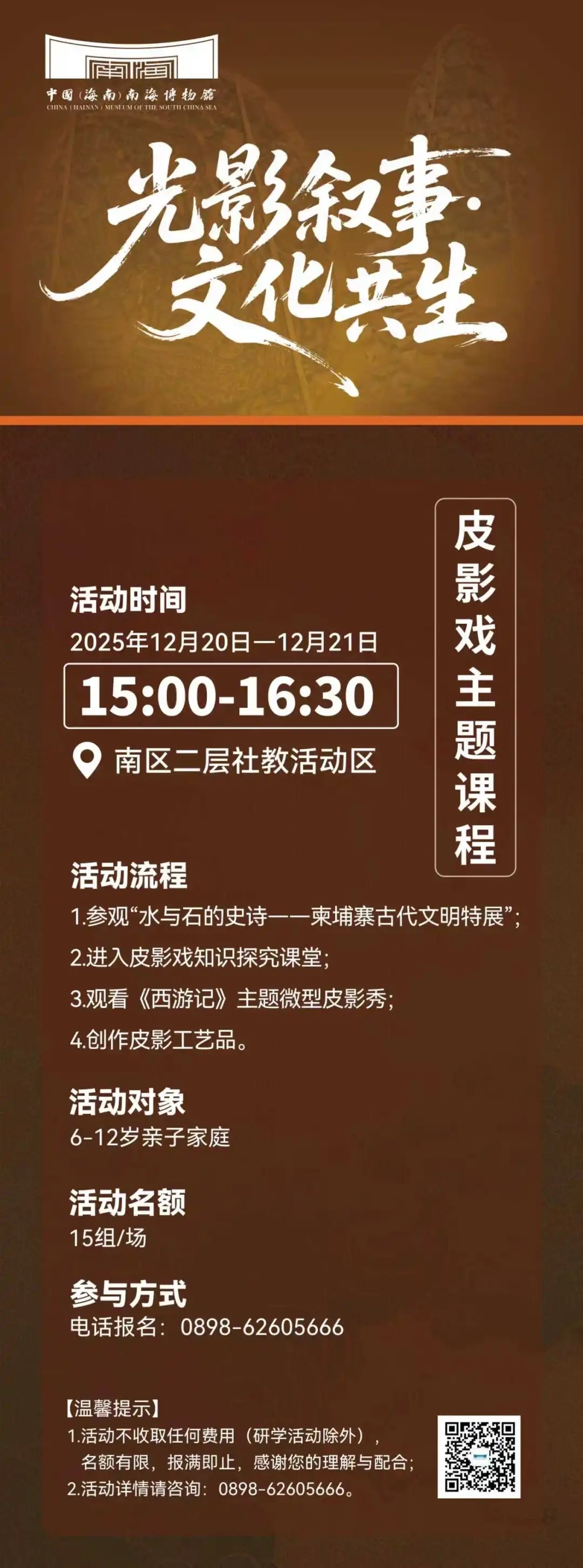 【活动内容与流程】1.参观“水与石的史诗——柬埔寨古代文明特展”;2.进入皮影戏知识探究课堂;3.观看《西游记》主题微型皮影秀;4.创作皮影工艺品。