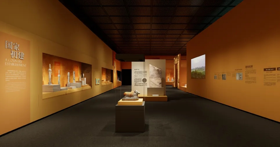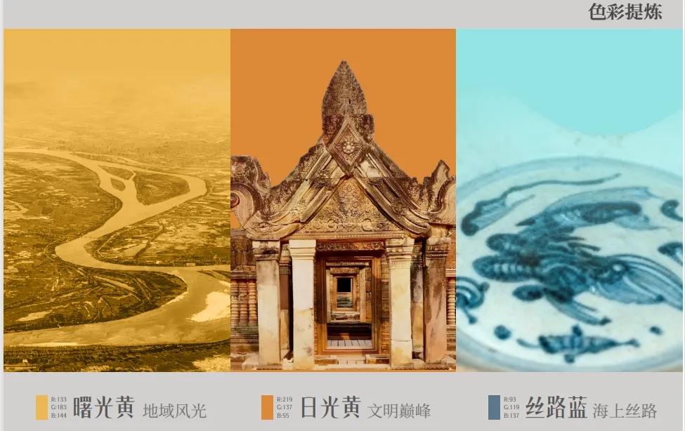 不仅是序厅,整个展览从柬埔寨的地域风光、建筑特色、海上丝绸之路间的贸易文明等方面提取设计灵感,选取了对应的曙光黄、日光黄以及丝路蓝为主色调,以柬埔寨文化遗迹图像营造氛围感,加上物理互动等方式,搭配出立体的场景,具有强烈的视觉吸引力与空间张力,让您在步入展厅的那一刻仿佛置身于当地。