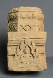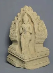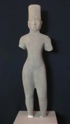 此尊造像展现了公元7至8世纪流行于湄公河三角洲的“诃里诃罗”神祇。其独特形象将毗湿奴(诃里)与湿婆(诃罗)合为一体,象征着两大主神神性的融合。细观此像,其前额上竖着的半只眼睛及扎起的发簇都是湿婆的标志,而不带装饰的圆筒状高帽则是前吴哥时期毗湿奴的显著特点之一。