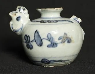 此件瓷罐为公鸡造型,目前公鸡头尚存,鸡尾已残缺。