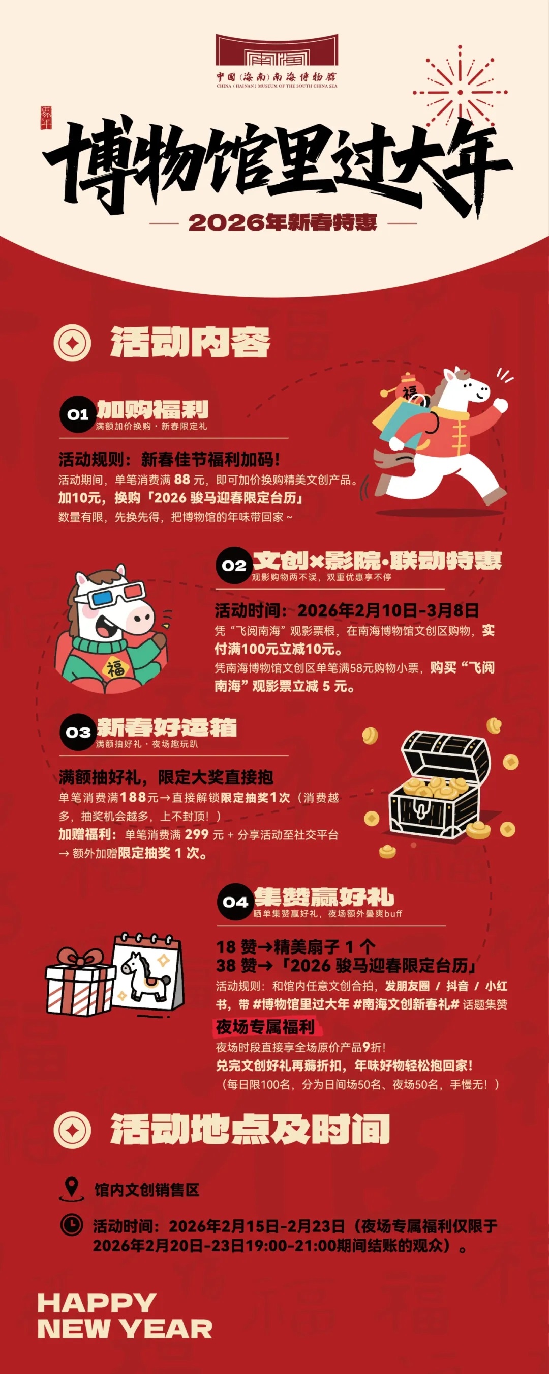 为满足广大观众在春节期间的参观需求,中国(海南)南海博物馆将于2026年2月17日-2月23日延时开放,具体安排如下: