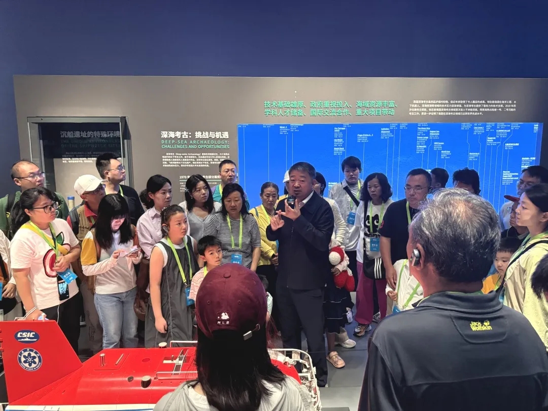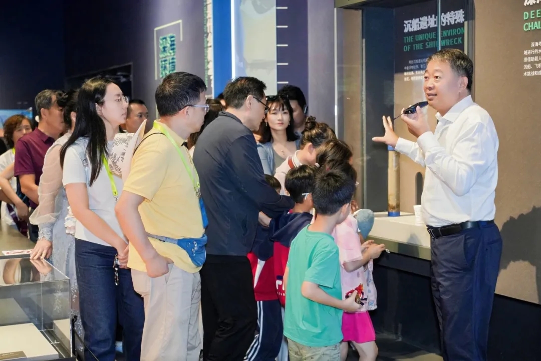 为满足观众深度了解南海文化与海丝历史的需求,馆长亲临展厅,以专业的视角、生动的语言,带领观众畅游深蓝,深度解读南海沉船、贸易珍品背后的海丝故事,让观众沉浸式领略深海考古的魅力。