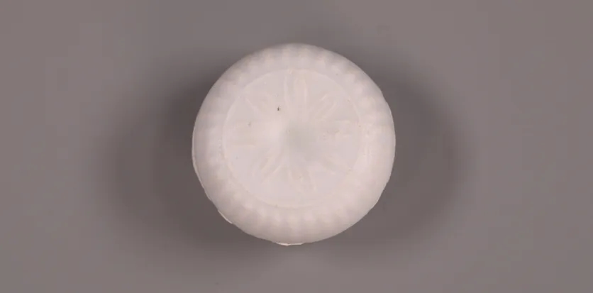 这件宋青白釉菊瓣纹印花粉盒呈扁圆形,子母口相合,盖顶中央印花卉纹,周身是菊瓣纹,器身施青白釉,素雅又温润。它是古代女子用来存放香粉、胭脂的器具,小巧精致,尽显宋代女性低调内敛的雅致。