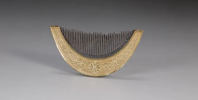 这件清银镀金花卉纹梳,梳背为月牙形,一面錾刻卷草花卉纹,外饰一圈连珠纹,另一面为累丝花卉纹,梳齿木质排列紧密有致。轻轻梳理长发,是再日常不过的动作,却藏着女性生活里的温柔仪式感。