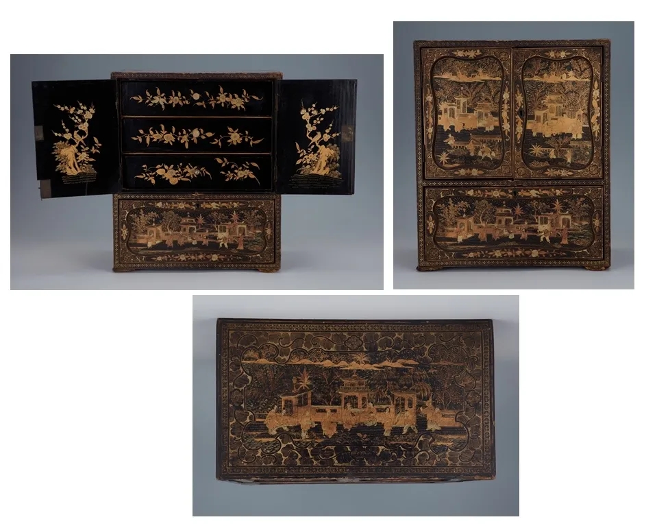 清黑漆描金庭院人物首饰盒
