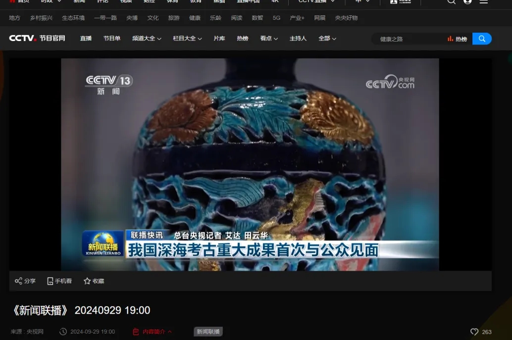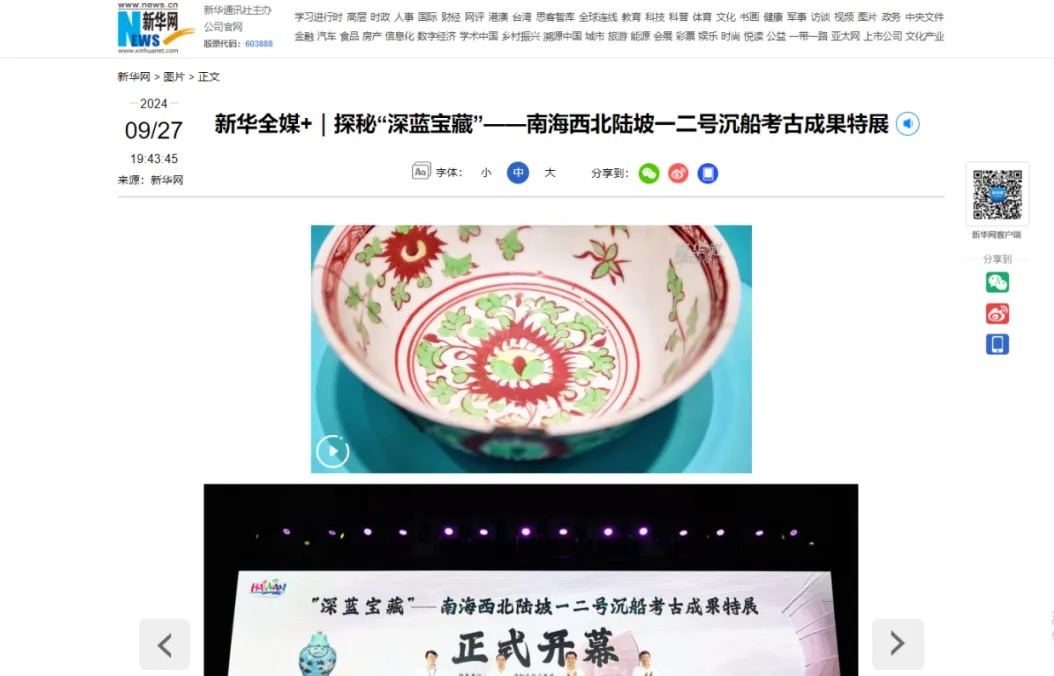 “深蓝宝藏——南海西北陆坡一二号沉船考古成果特展”备受各界瞩目,开展前后登上《新闻联播》《焦点访谈》《共同关注》《第一时间》等央视新闻栏目与《寻古中国》《考古学家的神秘武器》《深海遇上丝路》等纪录片,线上虚拟展厅人气持续增长,央视新闻客户端点击量超738万次,并成功入围第二十三届(2025年度)全国博物馆十大陈列展览精品推介终评。